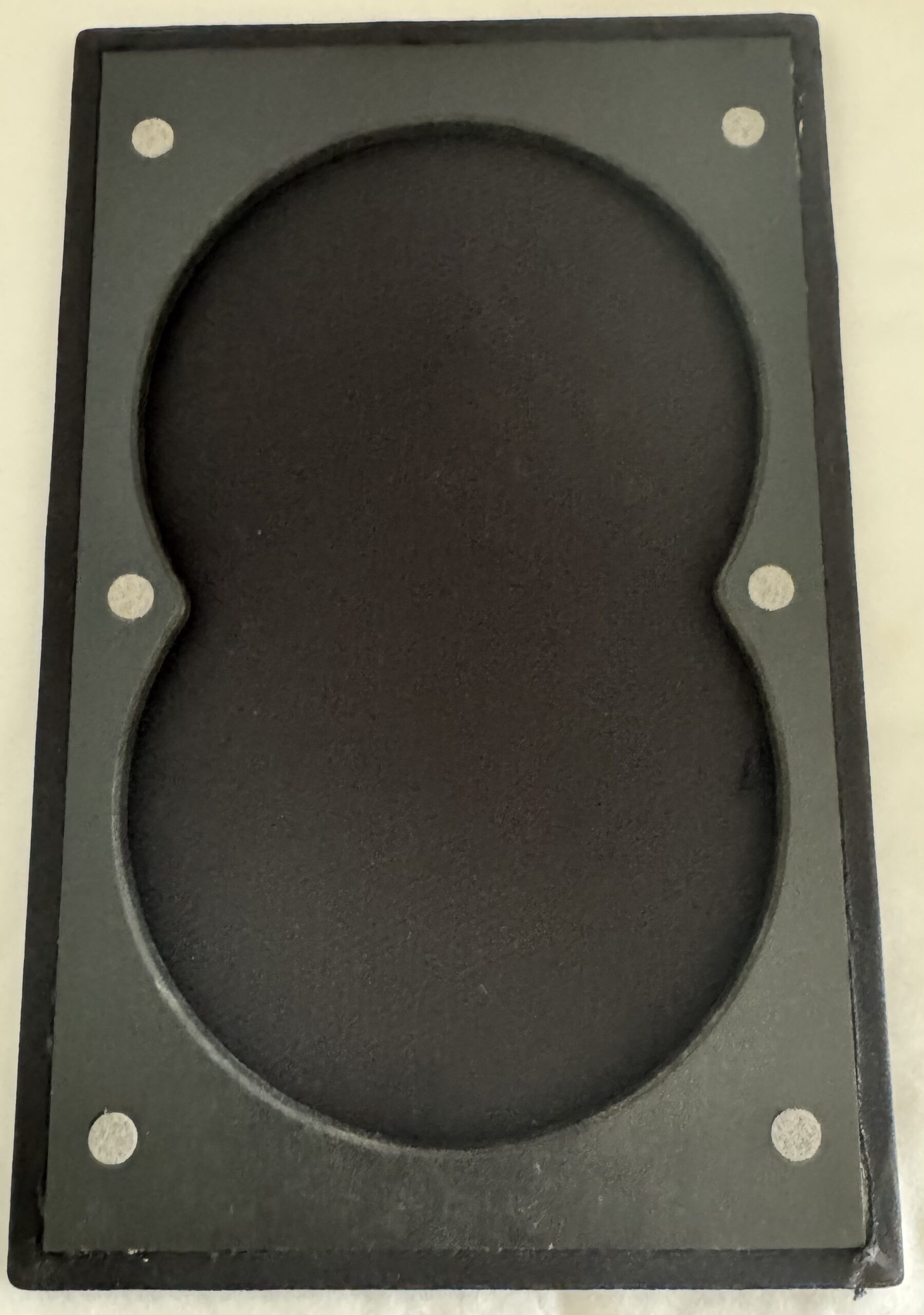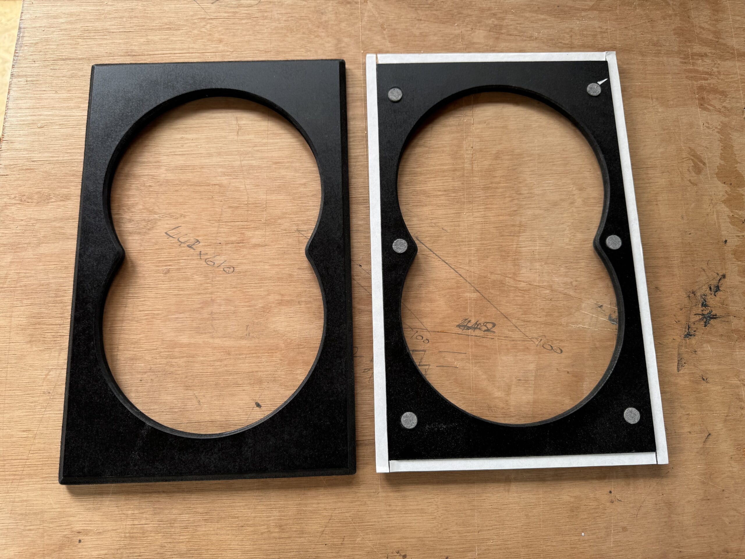 I replicated the magnet positions on the back of each grille. I didn’t have any 3 mm neodymium magnets, but I did have plenty of 2 mm and 1 mm thick x 10 mm round magnets that when stacked back to back achieve the same result. 6 of each were fitted to each cabinet, and a further 6 to each grille. They’re pressed in with a dab of epoxy.