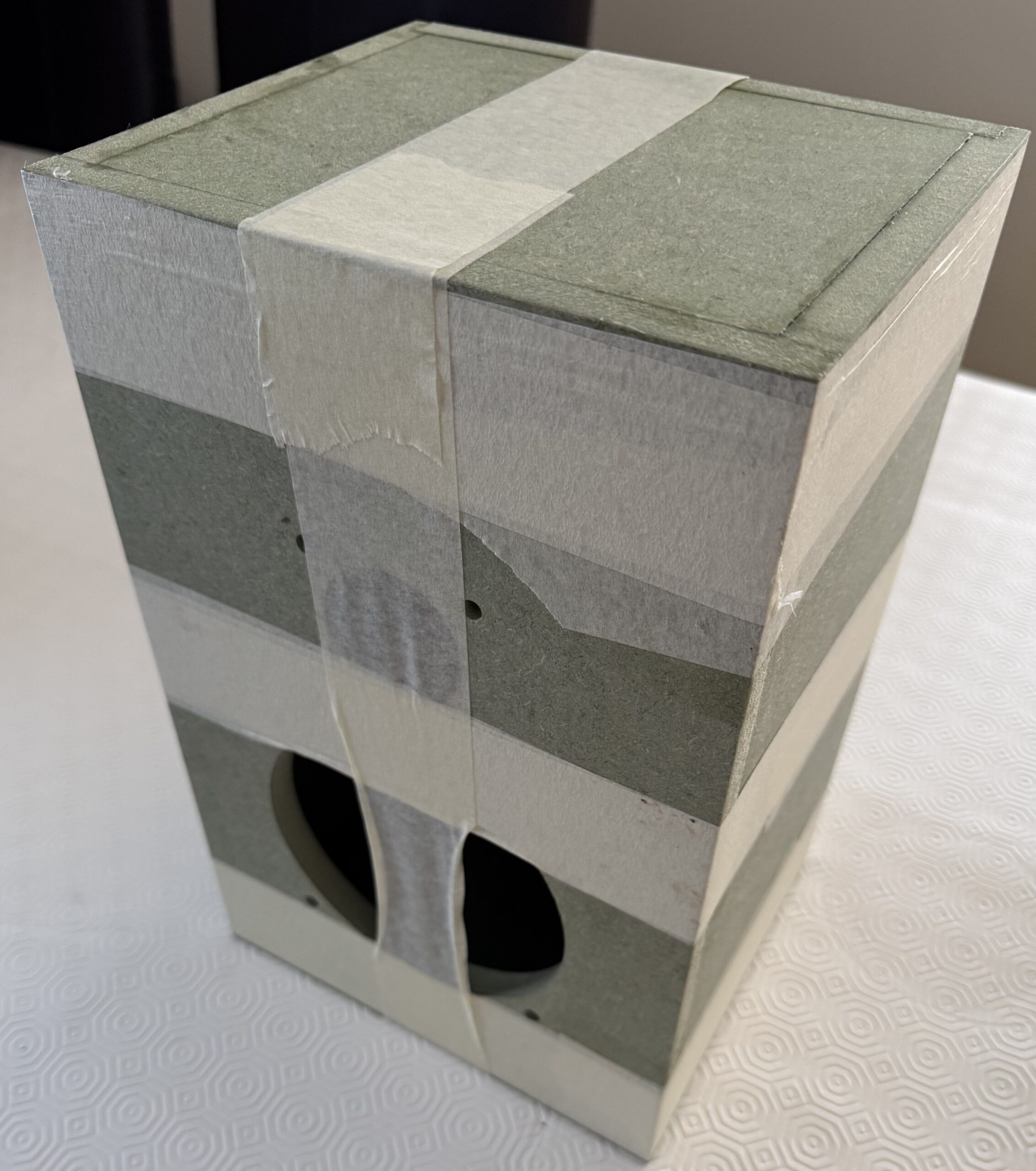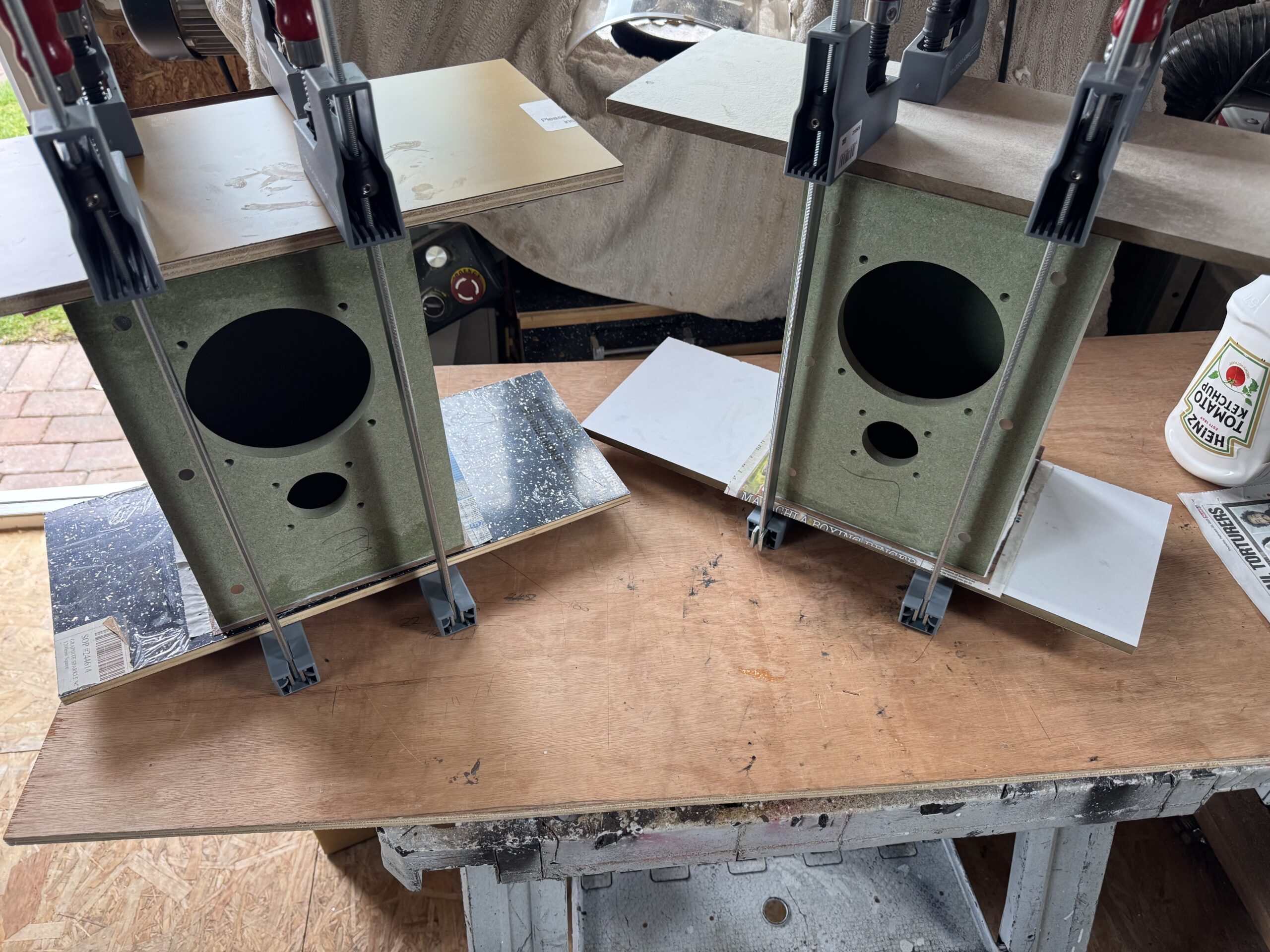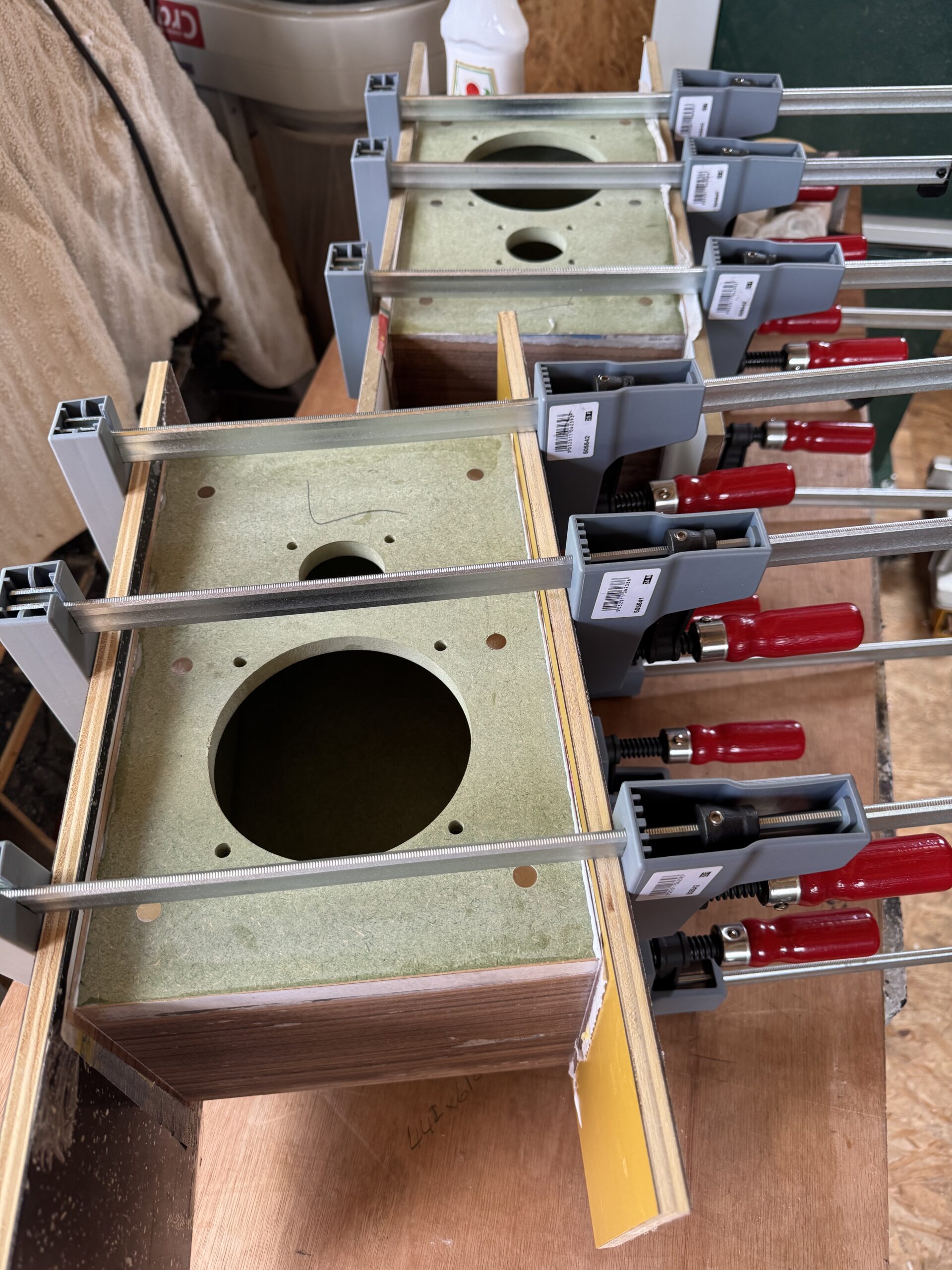 Newspaper sits between the clamping sheets and the veneer surfaces, so the speakers don’t stick to the clamping sheets if any glue soaks through gaps in the veneer. Wax paper would work better for this, but I didn’t have any to hand.