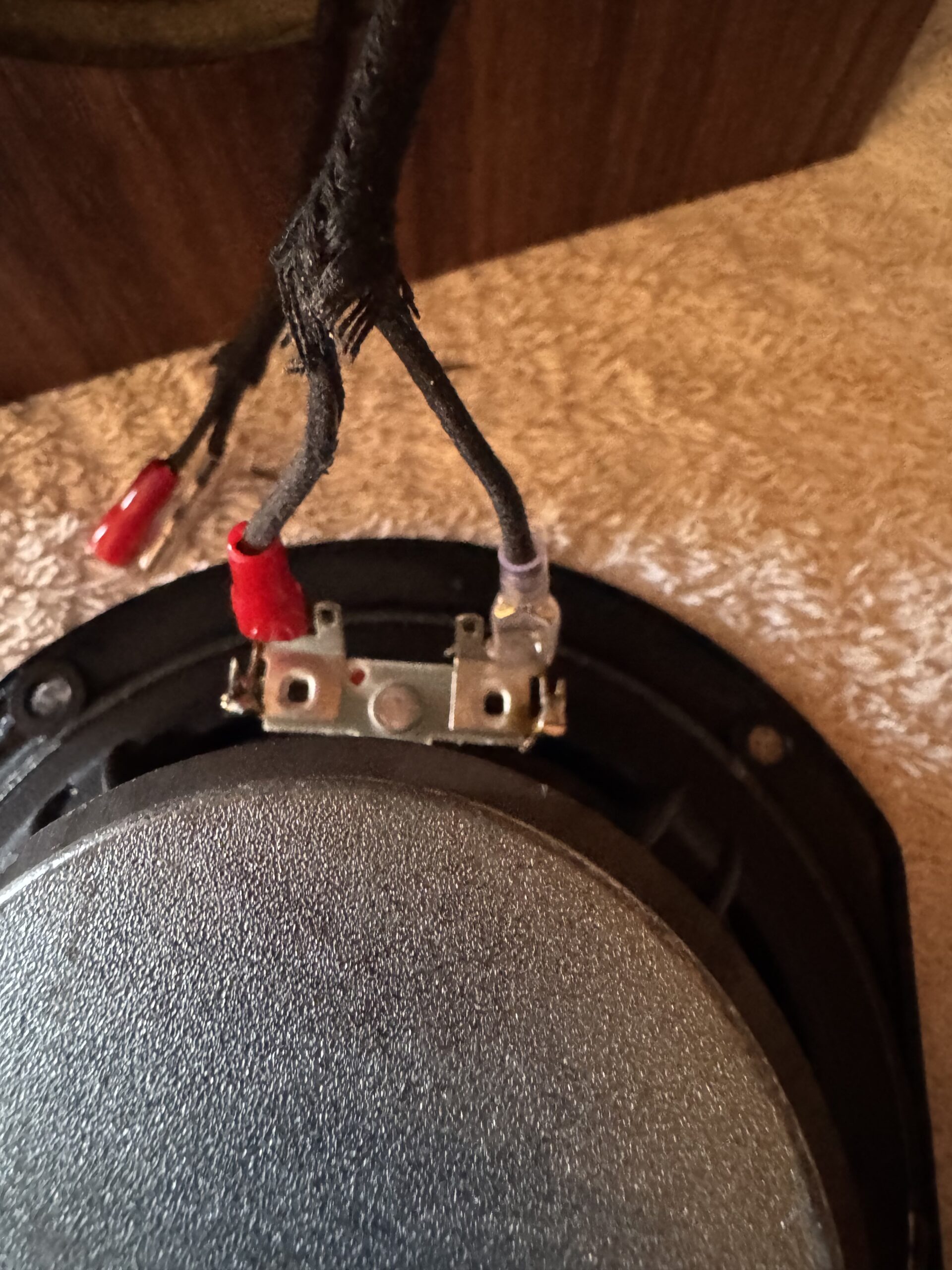 The smaller of the spade connectors fit the tweeter, the larger the woofer. They can be crimped to the ends of the stripped and tinned cable using pliers, and then soldered in place. Don’t forget to put the coloured boots on the cables before you install the spades – I did, and you can’t fit them later. For some reason a couple of the spades didn’t solder very well, and their enclosed crimp ends make them difficult to remove and reuse. I ended up cutting them off and the wires were soldered directly to the drivers, which is a more reliable connection anyway.