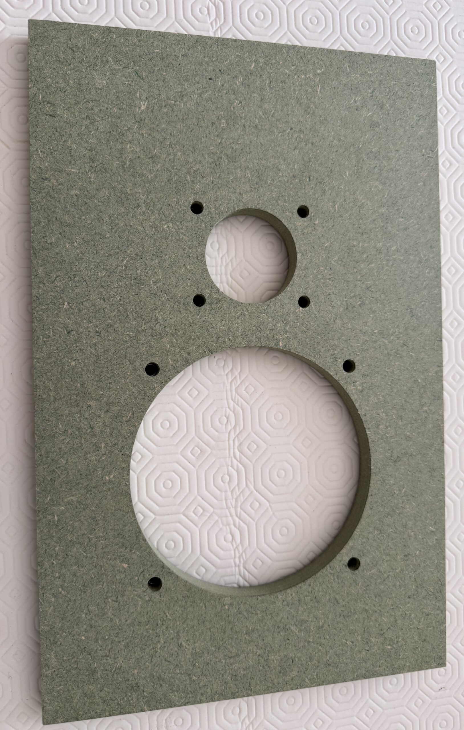 Deviating from the kit for a moment. I knew I wanted to add grilles, but I wanted to do so without visible fixings. I made a template for my grille by first cutting a piece of scrap MDF to the size of the front, minus 2 mm horizontally and vertically. I then traced a curved shape onto the template, roughly following the shape of the long side of the woofer basket. I replaced that shape on both ends,, sweeping slightly inward at the centre to give me some mounting points.