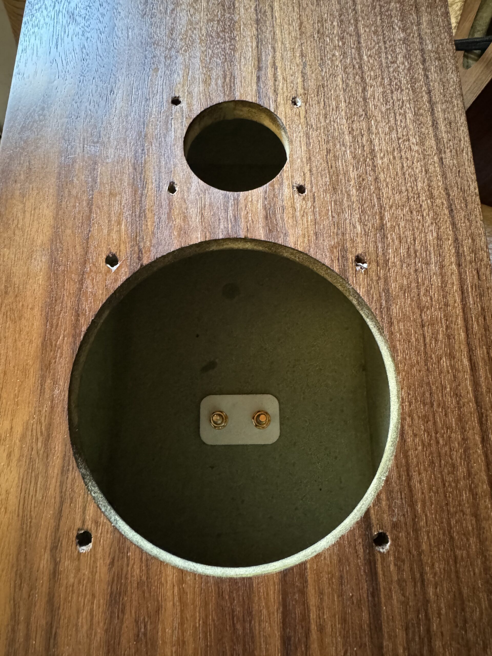 Now to bring everything together. In the process of veneering we covered the bolt holes for the drivers so those need to be located. I poked 3 and 4 mm brad point drill bits through the M4 and M5 t nuts respectively, pushing them carefully from the inside of the cabinet until the point of the bit came through the veneer.
