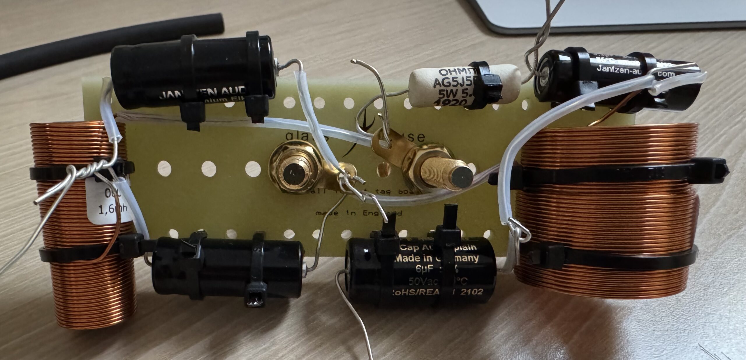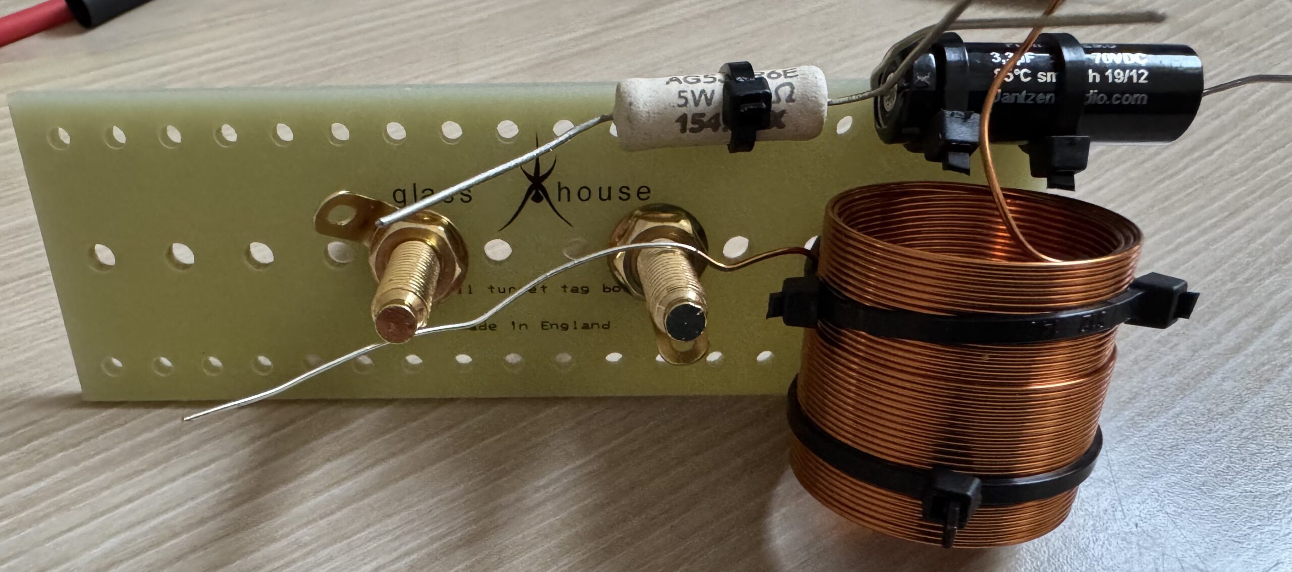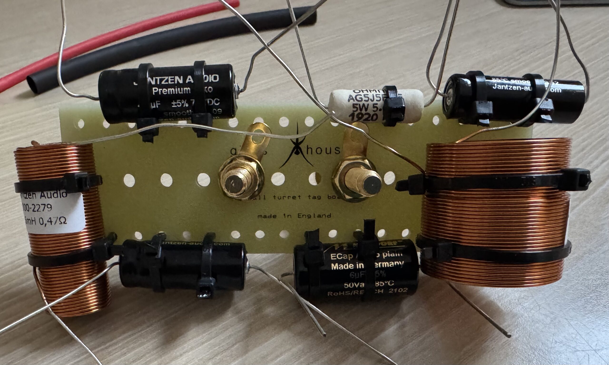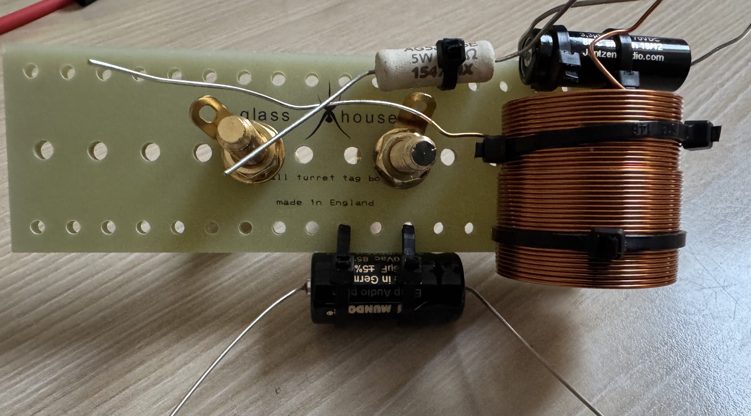 The crossovers are built on a Glasshouse tag board, mounted to the speaker terminals. Components are held in place with provided nylon zip ties, and the kit includes plenty of solder, sleeving and wire.