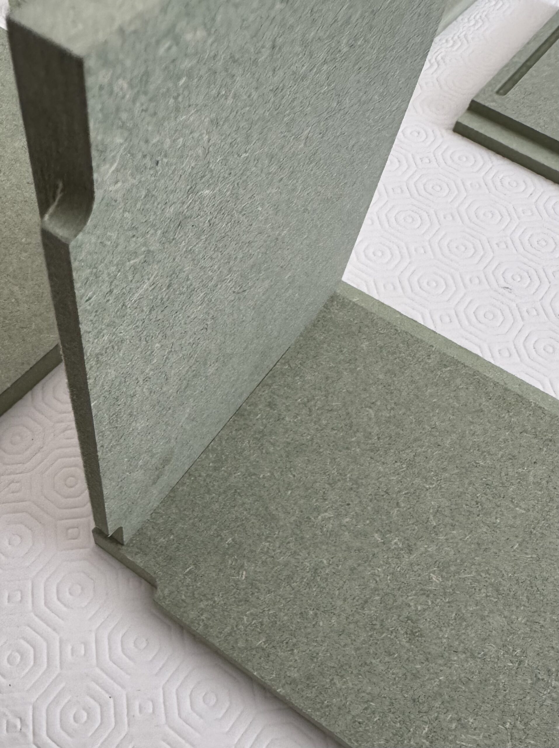 The kit is constructed of moisture-resistant (MR) MDF, noted by its green core. This is an unnecessary expense where performance is concerned but it makes assembling the cabinets a lot easier. Standard MDF soaks up water-based glue like a sponge, so your assembly time is drastically shortened unless you prime it with an adhesive layer first. Likewise the face grain of MR MDF won’t soak up your adhesive before you get a chance to lay and clamp a veneer, so you’ve less chance of a final glue-up with patches of veneer that haven’t adhered.